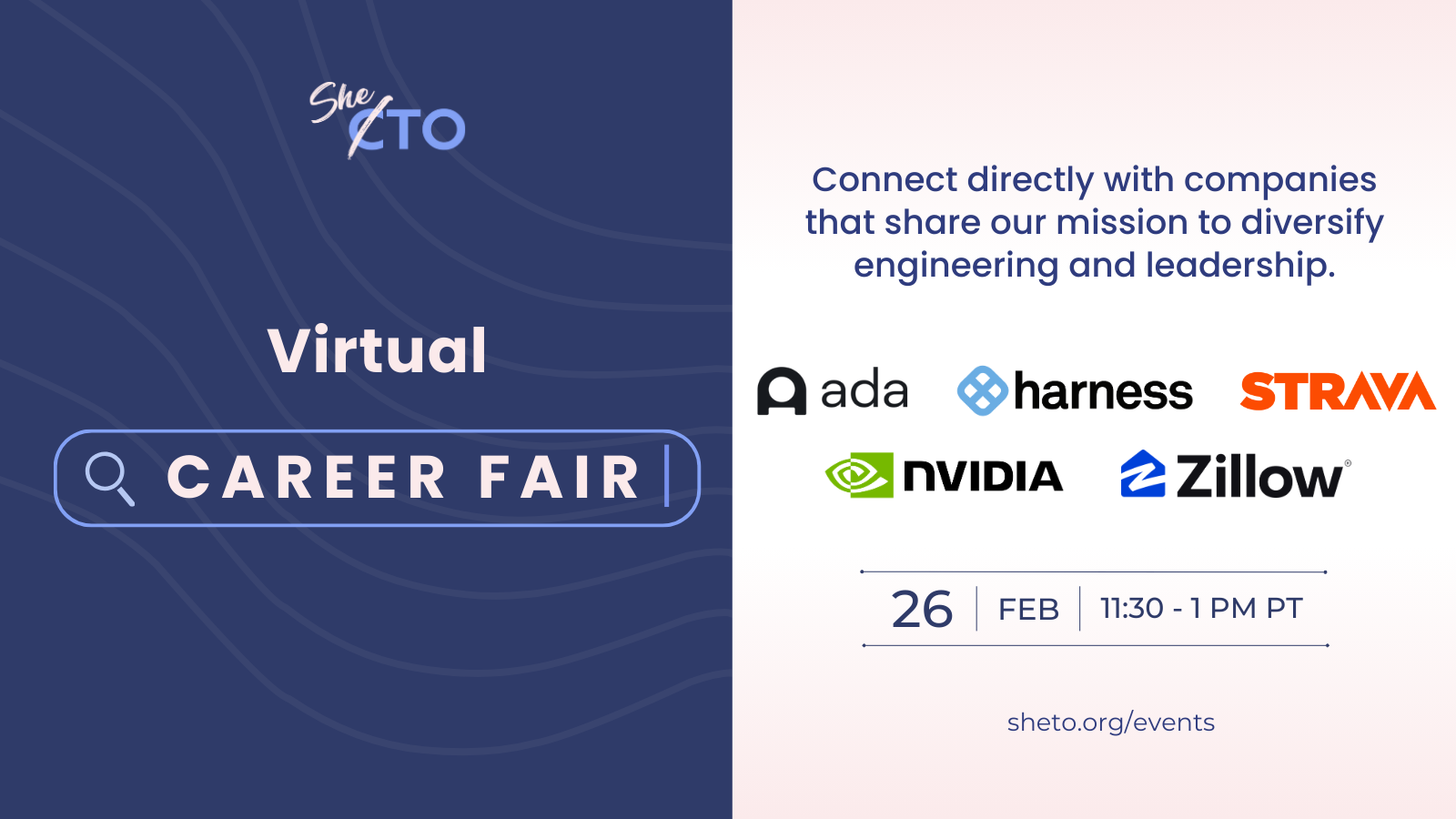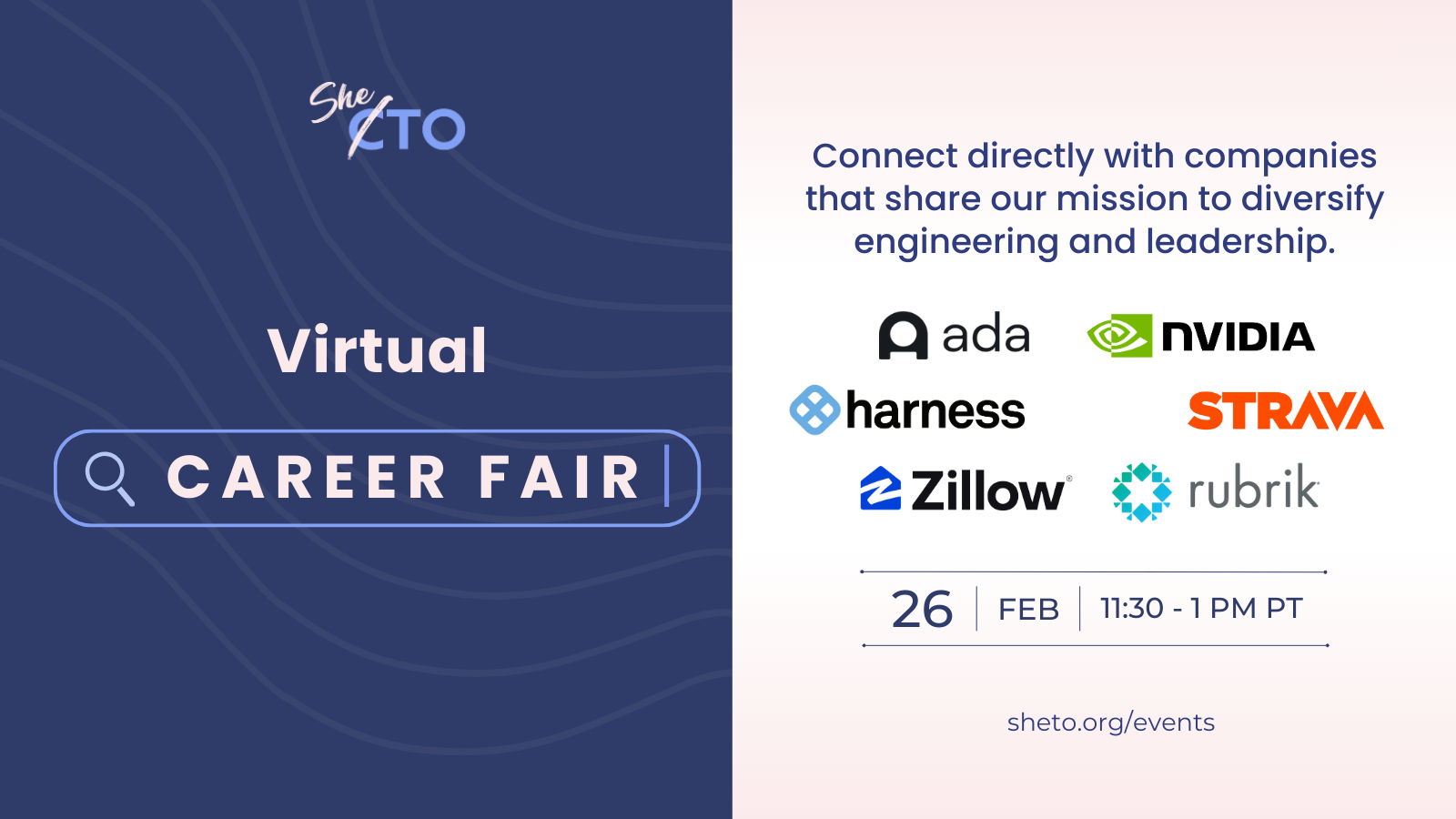 Recruiters from some of our mission-aligned partners including Ada, Harness, Strava, NVIDIA, Zillow, and Rubrik will be attending this event to share insights into their unique culture, what makes them a great company to work with, and to answer your questions about their currently open roles.